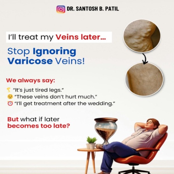 “I’ll treat my veins later…” the most dangerous line your legs could hear! Varicose veins aren’t just a cosmetic issue they’re a sign of poor blood flow that can lead to swelling, skin darkening, ulcers, and even blood clots if ignored. So stop waiting for “later.” The right time to treat your varicose veins is now before they get worse. Advanced, painless and minimally invasive endovascular treatments can help you walk pain-free again! . . . . . . #VaricoseVeins #VaricoseVeinTreatment #LegPainRelief #EndovascularTreatment #HealthyLegs #DrSantoshPatil #InterventionalRadiologist#